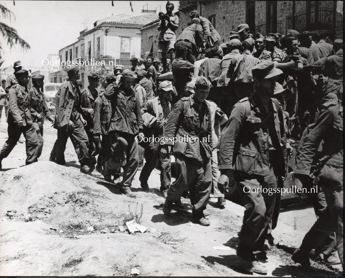 Originele WWII Britse persfoto 'Canadezen nemen Duitse soldaten gevangen bij de Piazza-Armerina, Sicilië (Italië)'